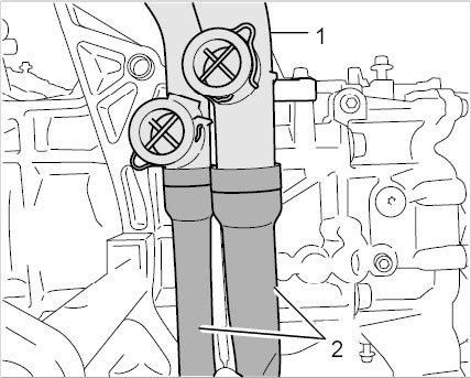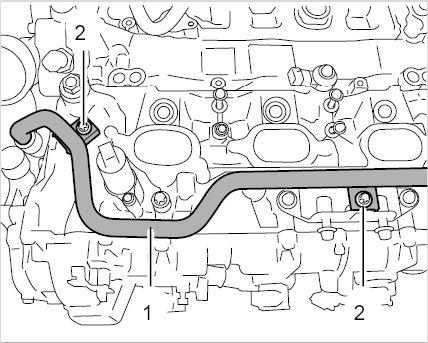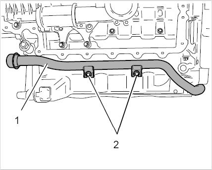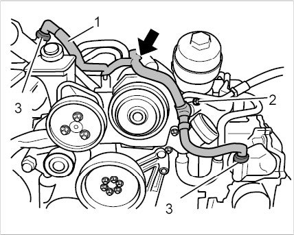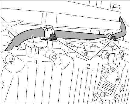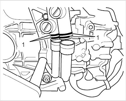 22. Remove positive crankcase ventilation line -1- (air conditioning compressor remains in the vehicle when you remove the engine).