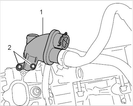 44.3. Pull the thermostat housing -1- down at the unit carrier (double O-ring seal) and lift it off at the connecting tube -2- to the coolant pump at the same time.