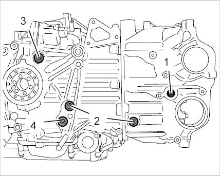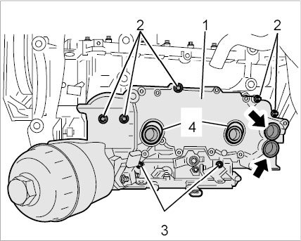 46.1. Cover on cylinder bank 1-3 -1-: Unscrew three external Torx screws (M6 x 20) -4- and replace O-ring -3- and moulded seal -2-.