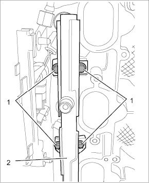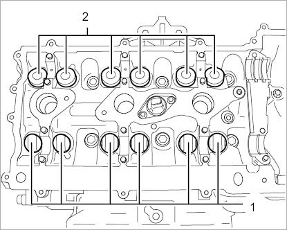 4.1. Pull six bucket tappets -1- and six switching tappets -2- out of the fitted bores in the cylinder head with your thumb and index finger. Do not use a magnet.
