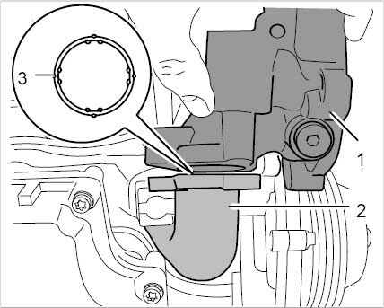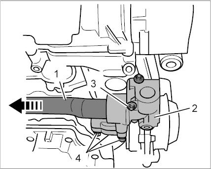 16.1. Unscrew two external Torx screws (E10, M6 x20) -2- and pull the connection piece out of the crankcase.