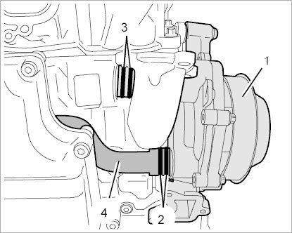 24.2. Unscrew two external Torx screws (E10, M6 x 12) -4- and pull off the intake tube. Replace O-rings.