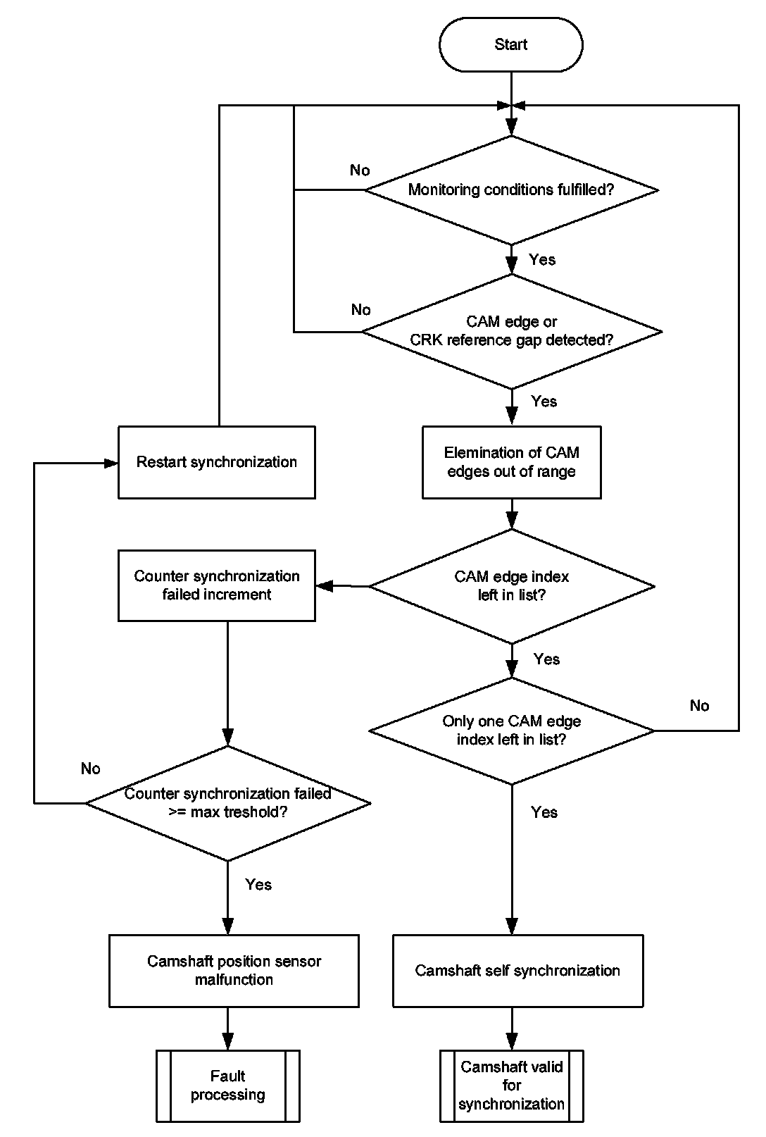 The monitor eliminates with every event the edges from the list of all 8 cam edges, which are not insides the pattern. If only one edge is left, the edge number is identified and the camshaft is valid for synchronization. If no edge is left in the list, synchronization failed and is started again. If a calibrated number of synchronizations failed, the error is delivered to the error management. Afterwards, and only if synchronization fails with the intake camshaft.