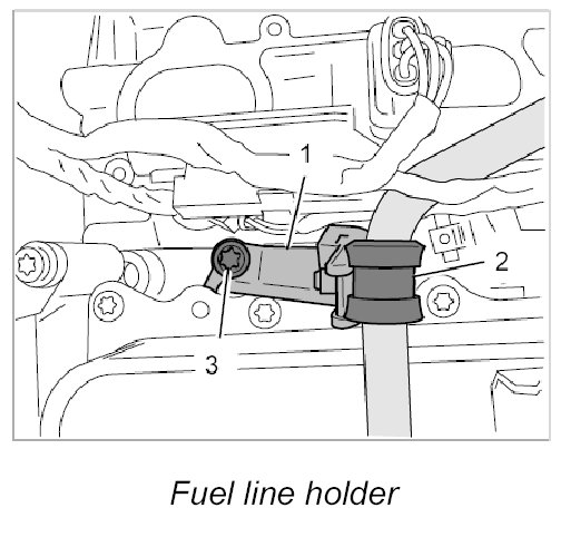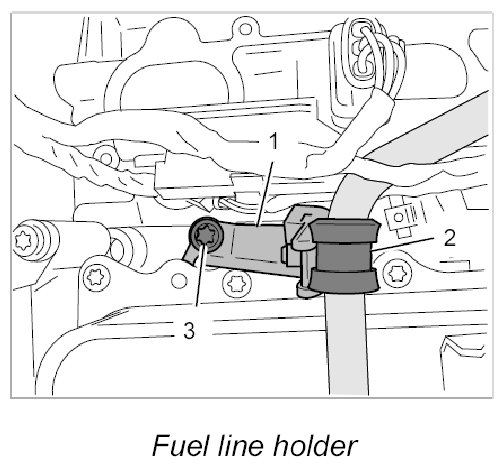3.1. Unclip line at the resonance tube -arrow- and feed line for the carbon canister -1- and set them aside.
