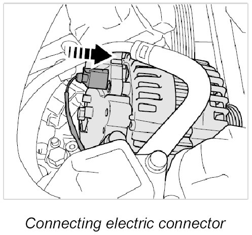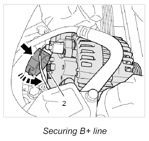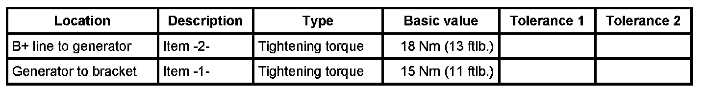 1. Place the generator on the engine, fit the B+ line and tighten the fastening nut -2-. - Tightening torque: 18 Nm (13 ftlb.)