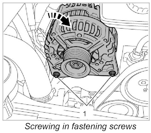 4. Fit the generator from above and screw in the two fastening screws -1-. - Tightening torque: 15 Nm (11 ftlb.)