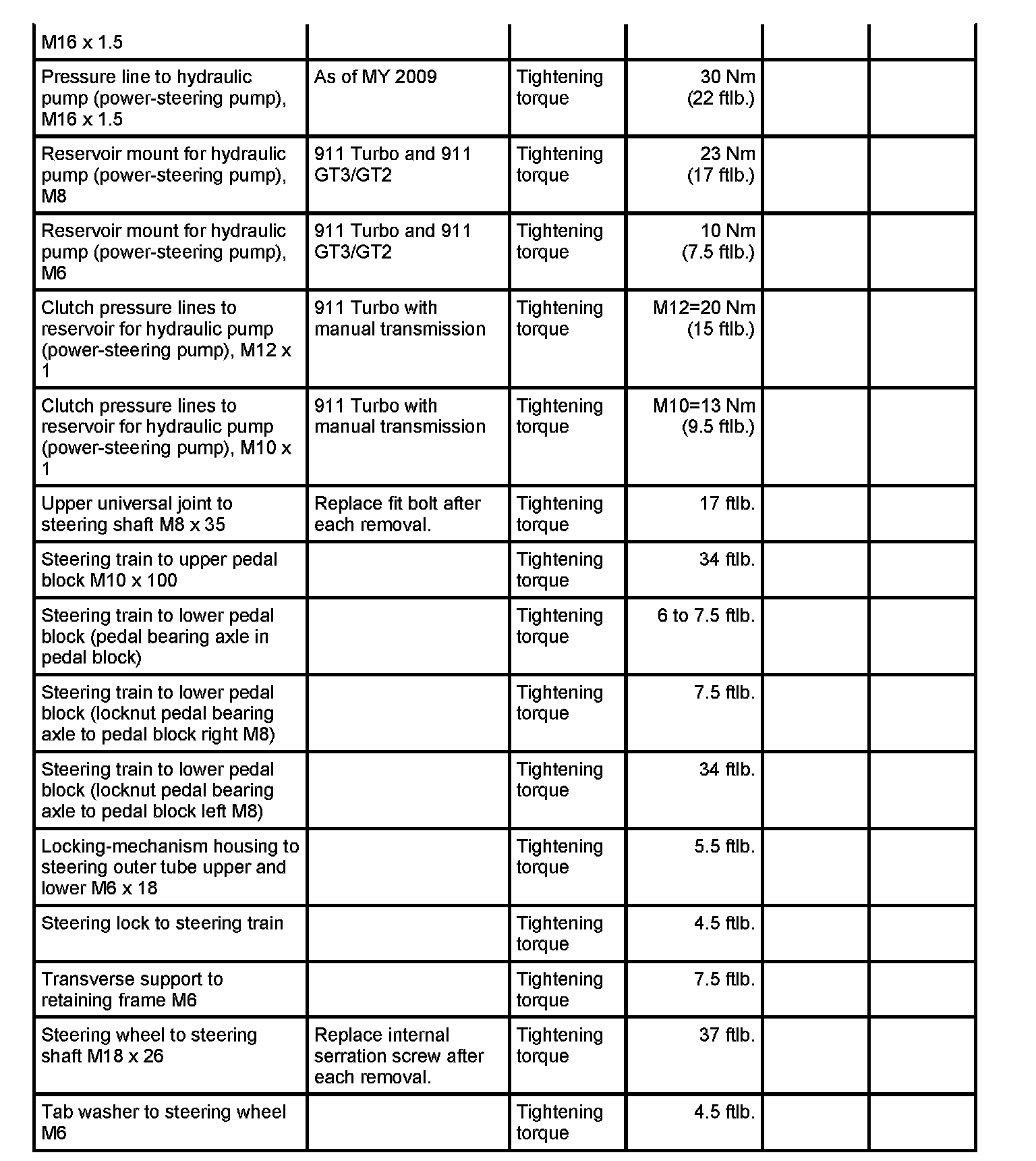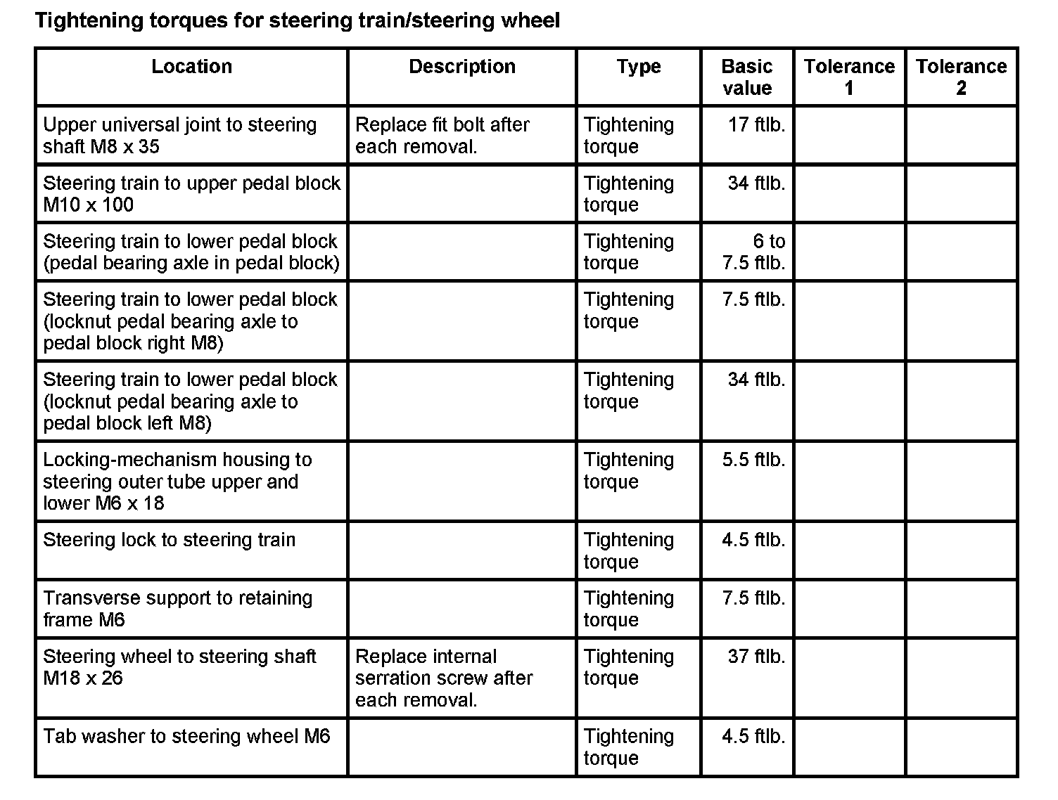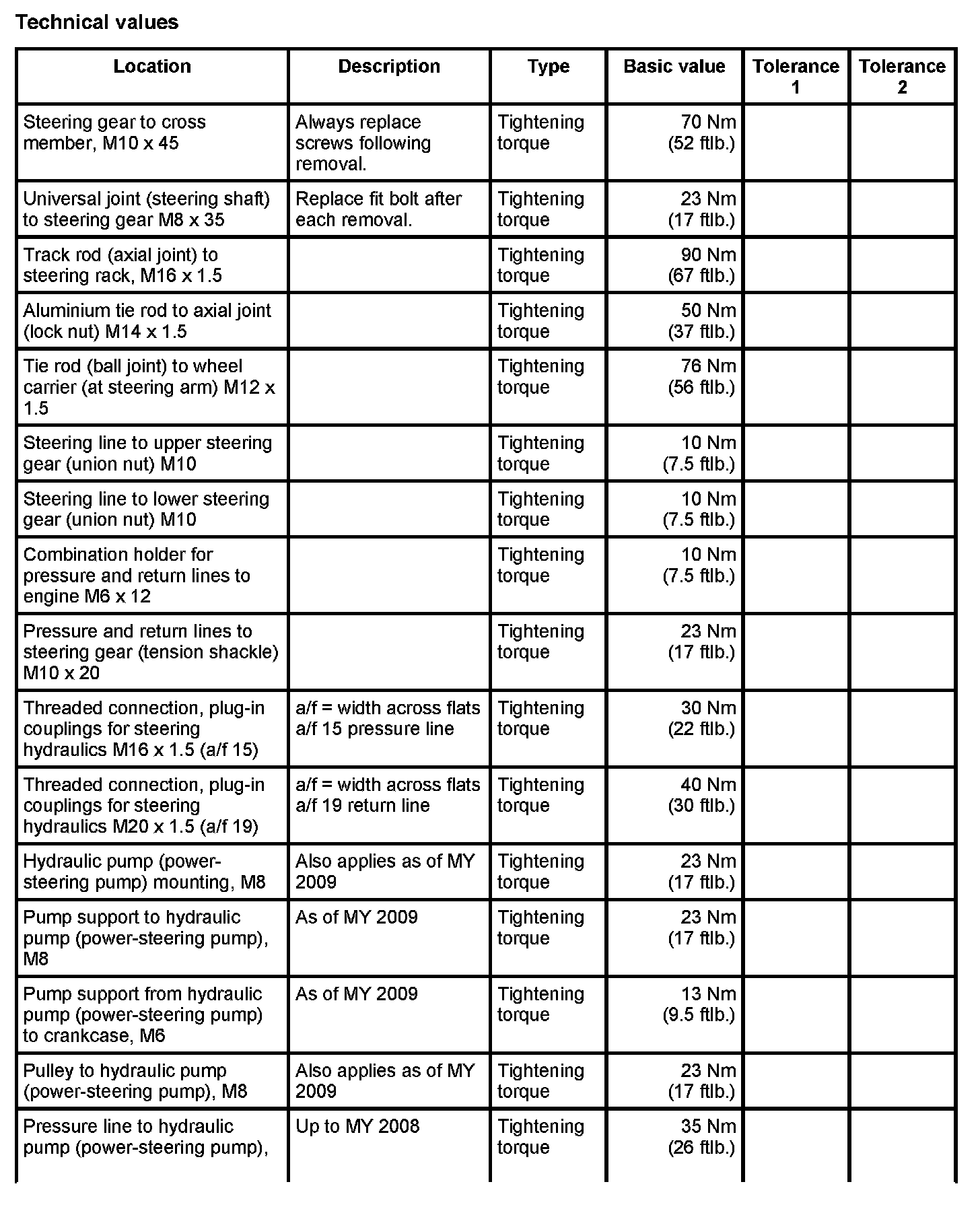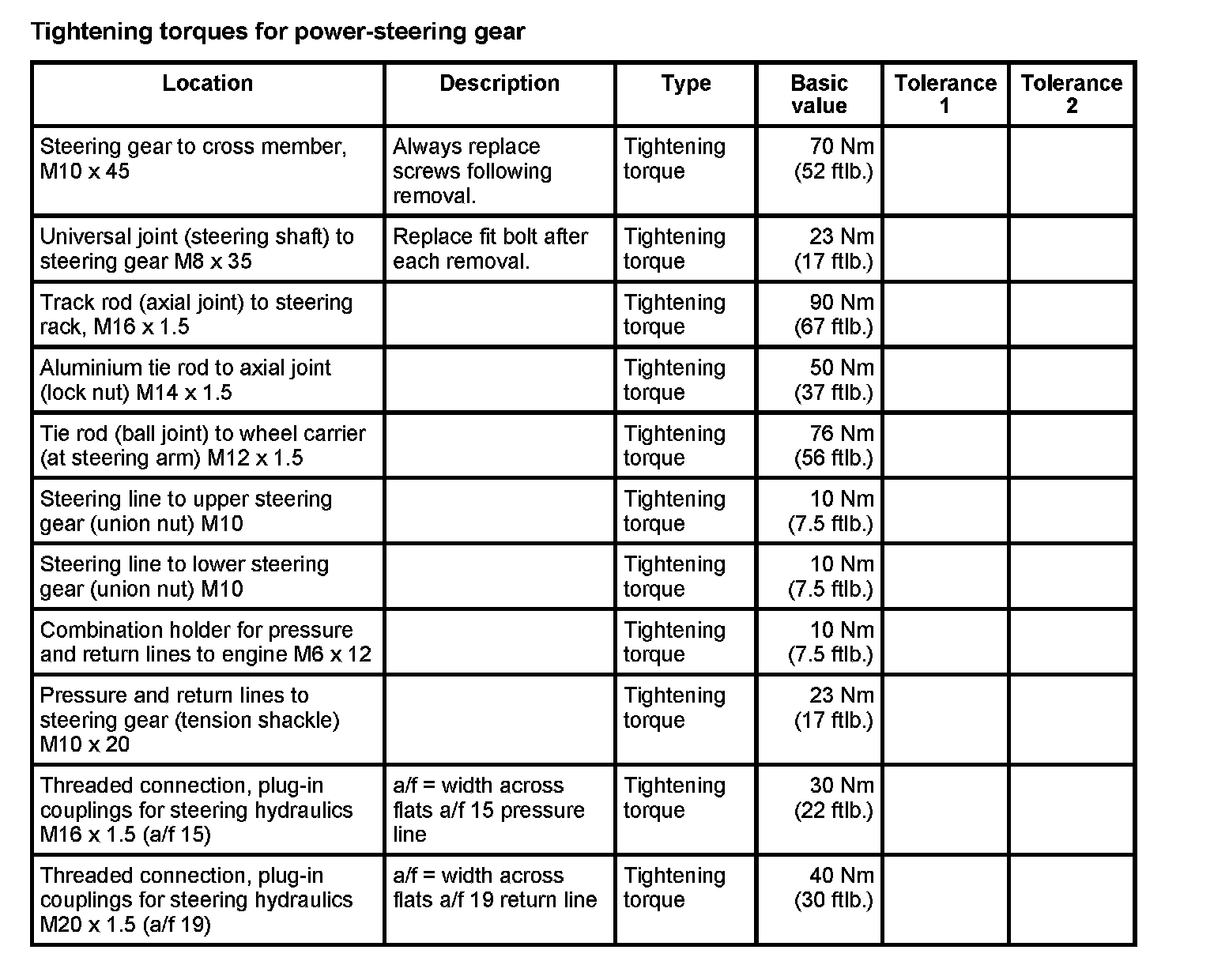 Tightening torques for