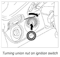 2. Position ignition switch in the instrument panel from below. Position union nut, re-adjust switch and tighten union nut using wrench T10152. - Tightening torque: 1.1 ftlb.