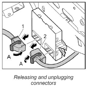 4. Release both electrical connectors -1, 2- -A- and unplug them from the control unit.