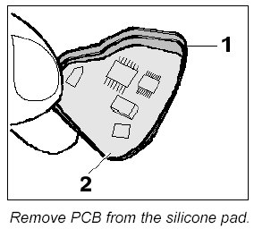 2. Remove silicone pad -1- with PCB from the remote control housing.