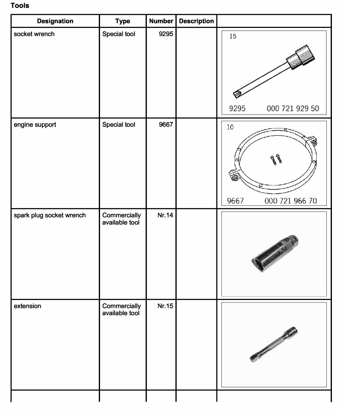 47. Remove six spark plugs. Always make sure to use spark plug socket wrench Nr.14 and extension Nr.15 to avoid damaging the ceramic body.