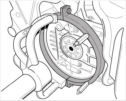 If complete disassembly is not required, the flywheel and clutch can remain fitted. In this case, the adapter for engine support 9667 must be fitted.