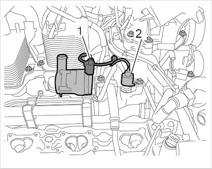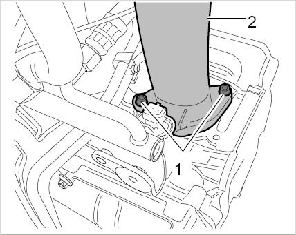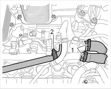 36.1. Open one screw type clamp on the heater pipe return line -2- and two screw type clamps on the supply line for the water pump and thermostat -1-.