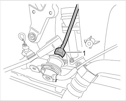 20. Loosen hydraulic line for the clutch at the power steering supply tank by pressing the plastic sleeve towards the tank using the disassembly tool Nr.21 and pull out the line.
