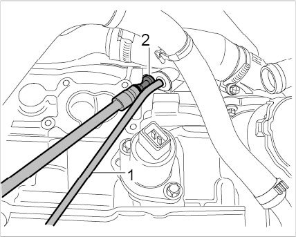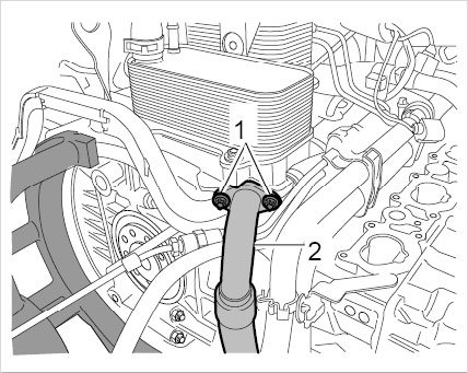 19. Remove vent lines -1- on the oil/water heat exchangers. Open two screw-type clamps and pull off the hoses.