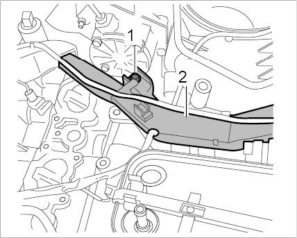30. Release cable duct -2-. Unscrew two Torx(R) screws (M6 x 16) -1- (on cylinder side 1-3 with fuel line attachment).