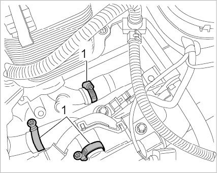 36.2. Loosen screw type clamps -1- on the coolant lines at the heat exchanger bracket.