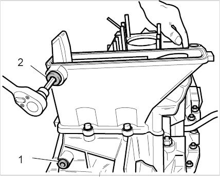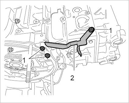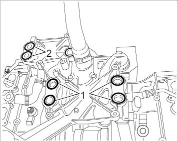 44. Take off coolant guide housing together with water pump and oil suction pump. Collect emerging coolant.