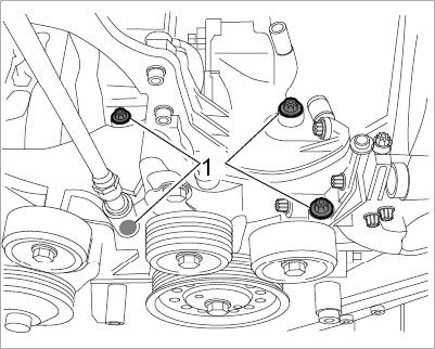 43. Remove secondary unit carrier. Unscrew four Torx(R) (screws (M10 x 60) -1-. Remove unit carrier and power steering pump.