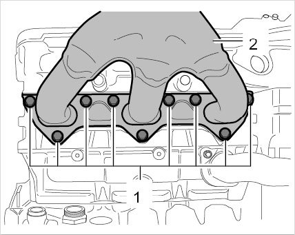 45. Remove exhaust manifold. Unscrew nine M8 x 28 screws -1- on each. Remove exhaust manifold -2- with metal seal.