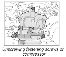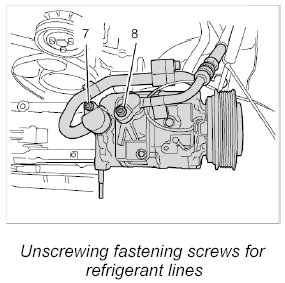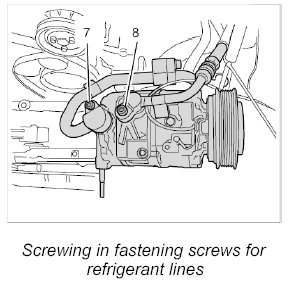 3. Unscrew the refrigerant line between the compressor and condenser at the connection points on the compressor and on the condenser and disconnect it.