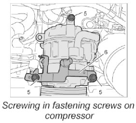 5. Fit compressor and bracket -6- and screw in the three fastening screws -5-.