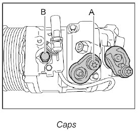 1. First, open the cap on the high-pressure side and relieve the pressure from the compressor -A-.