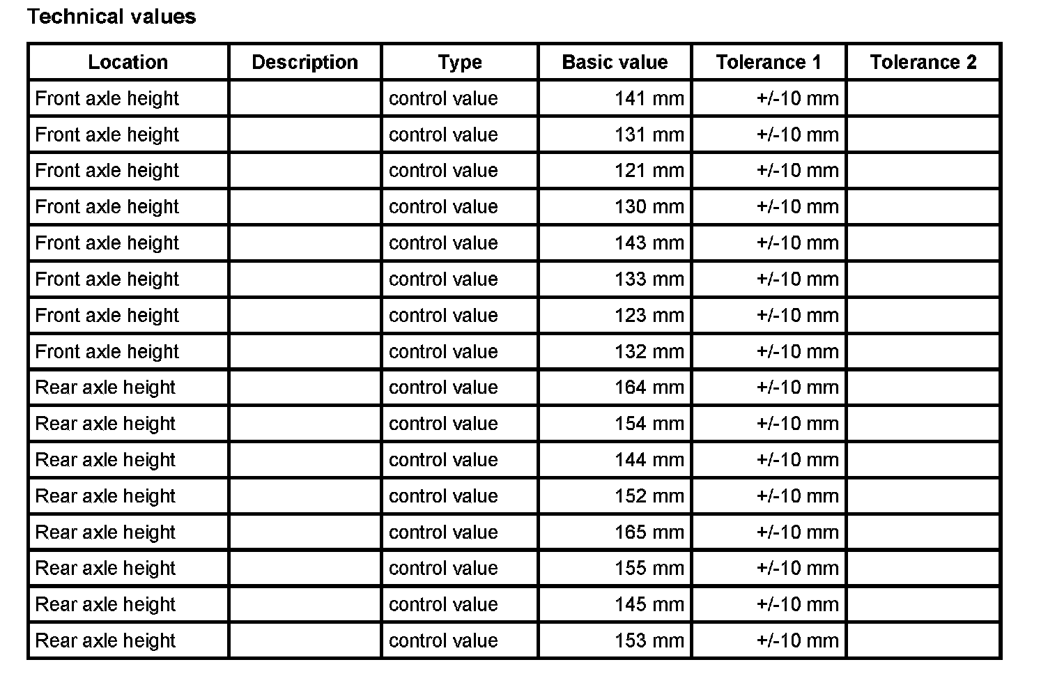 Adjustment values for suspension alignment