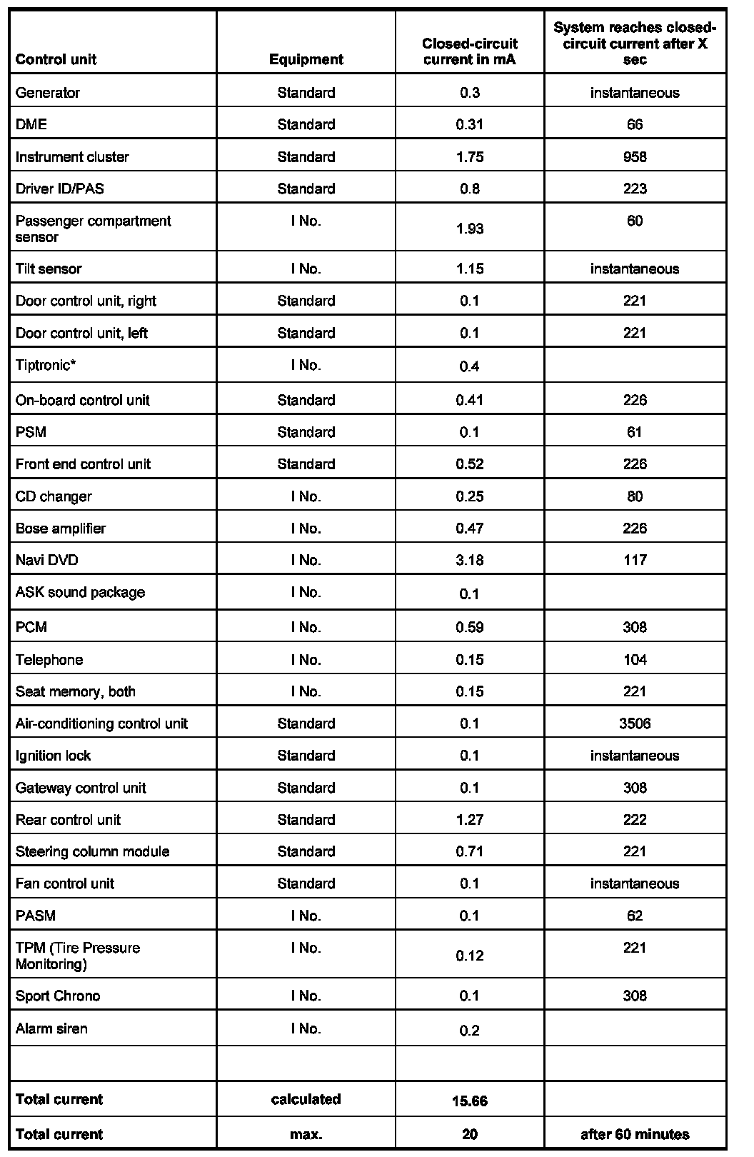INFORMATION: Before measuring the closed-circuit current, determine the vehicle equipment (I numbers) and establish the expected closed-circuit current with the aid of the attached table.