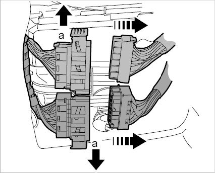 1. Unlock and disconnect electric plug connections on the main wire harness -a-.