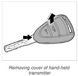 1. Insert a small screwdriver between the cover and the bottom part of the hand-held transmitter -arrow- and carefully lift off the cover.