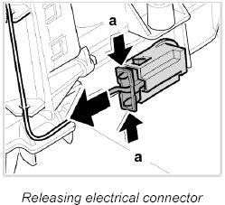 2. From the driver's side, reach around to the "driver's footwell" air vent to release and disconnect the electrical connector -a-.
