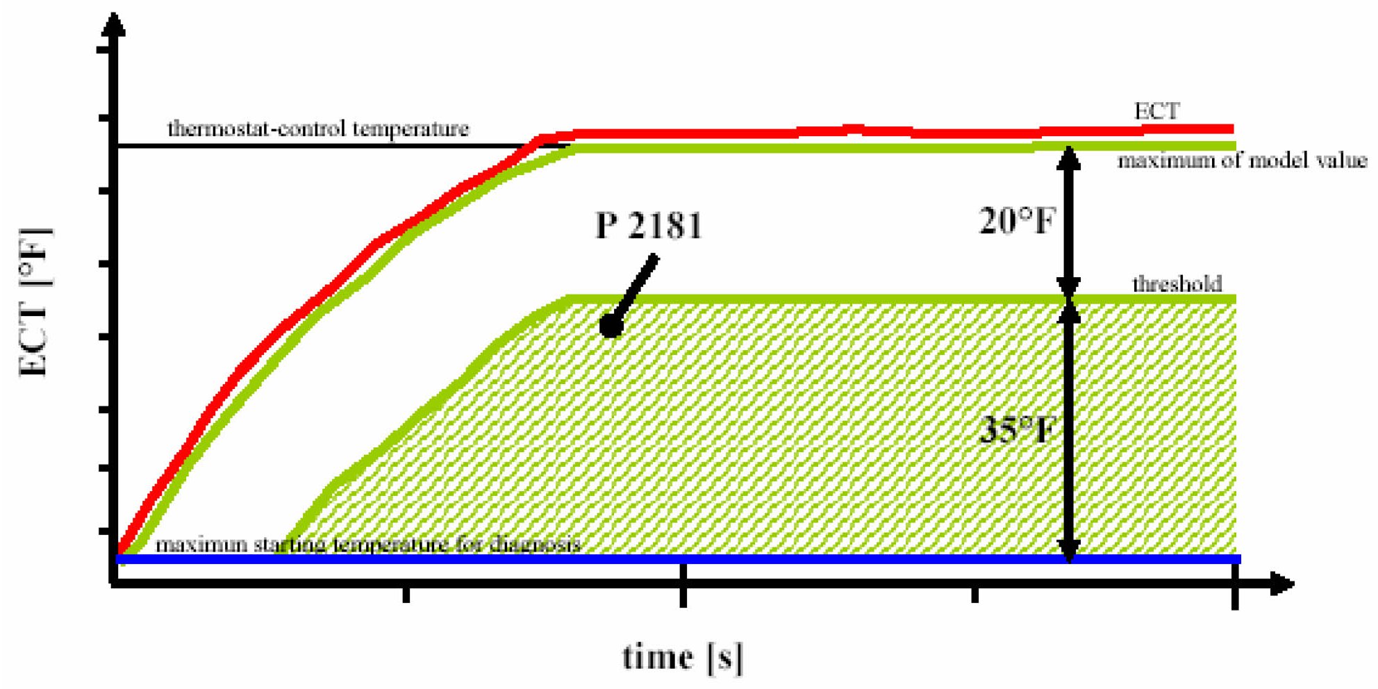 If the engine coolant temperature does not reach a certain value under normal driving conditions and sufficient mass air flow, the coolant system is defective.