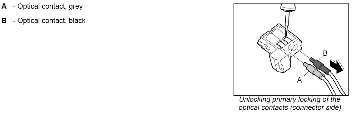 The LWL and the plug connections must not come into contact with fluids such as water, creeping compound, preservative, anti-freeze protection, cleaning agent. They will impair the MOST system function or cause complete system failure. Even plug connectors with plugged-in protective caps must not come into contact with the fluids listed.