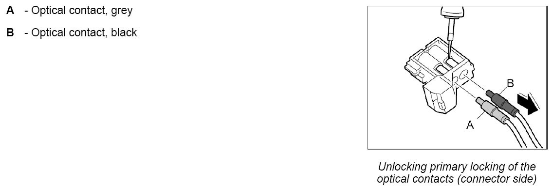 4. Carefully pull on the optical waveguide -A and B- in -direction of arrow-. If it is not possible to pull out the optical waveguide, check again if the locking mechanism is completely released.