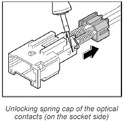 3. Position the press-out and unlocking tools for flat-type and round plug connectors of all sizes NR.155 for releasing the contact locking mechanism of the optical waveguide module and lift up the locking mechanism.