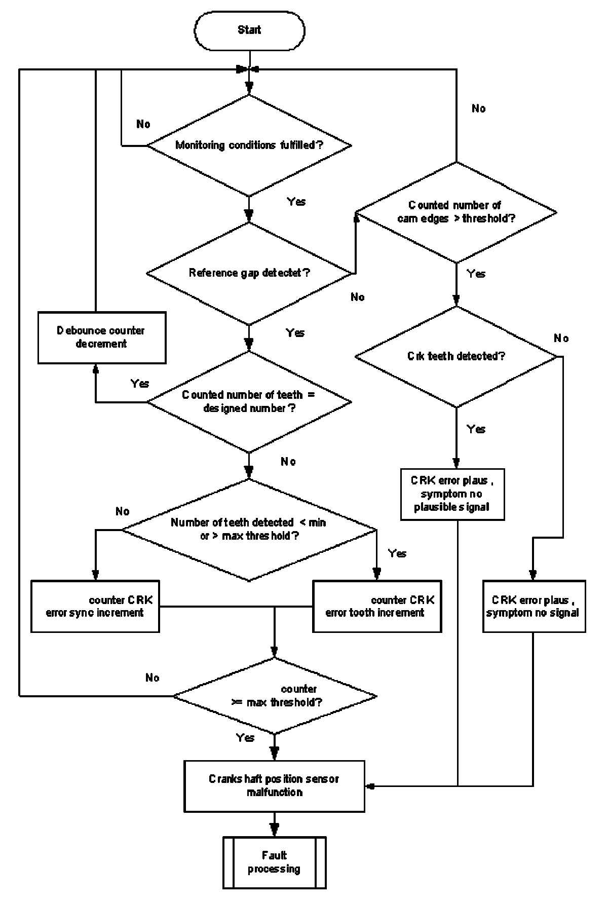 A teeth counter is incremented at every falling edge of the CRK sensor signal. If plus or minus one tooth is detected Flowchart diagnosis of mechanical reference position and diagnosis of chain jump. 360 °CA at the reference gap, the tooth number counter will be incremented. If the counter exceeds a limit, a CRK tooth error is delivered to the error management.