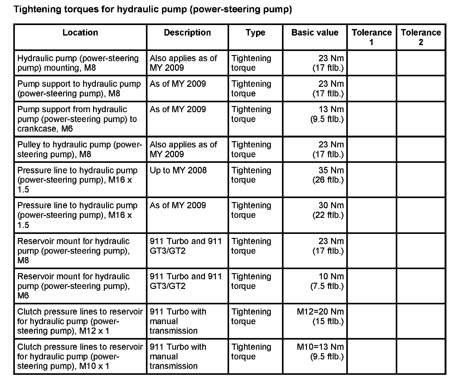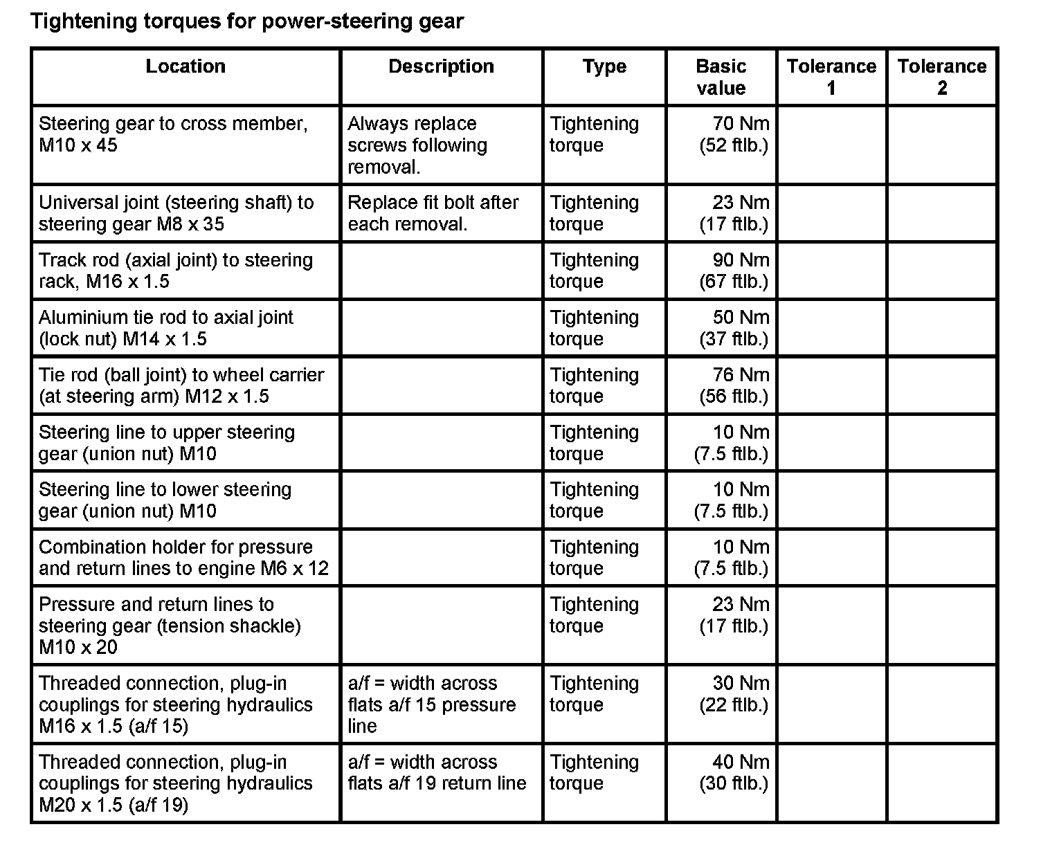 Tightening torques for