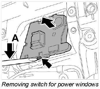 2. Lever off switch for power windows at the locking tab -arrow- (-arrow A-) and remove it.