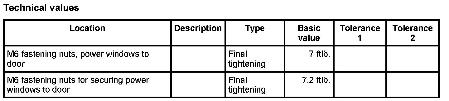 2. First position the lower fastening points of the power windows -1- to the dimension -X = 5 mm- and tighten with fastening nuts - 2-. Tightening torque: Final tightening: 7 ftlb.