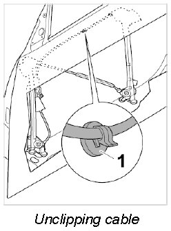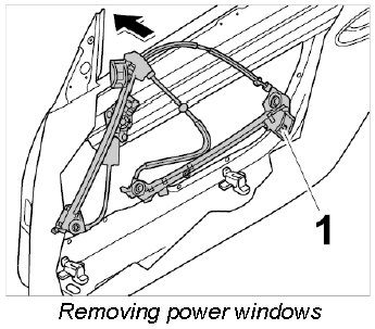 4. Fold power windows -1- together and remove through the door opening -arrow-.