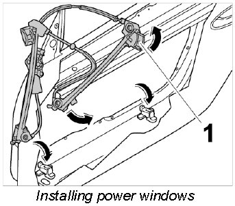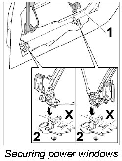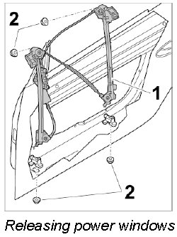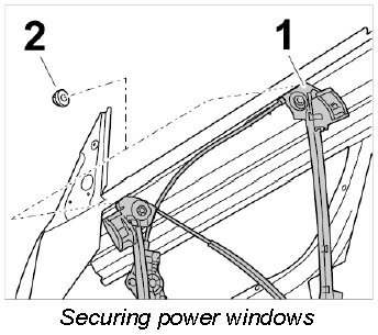 3. Unscrew fastening nuts -2- on power windows -1-.