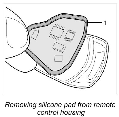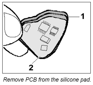 2. Remove silicone pad -1- with PCB from the remote control housing.