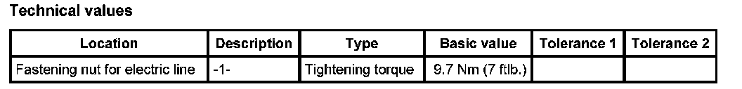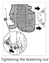 1. Engage the fusebox on the support and secure with the fastening nut -1-. Ensure that the electrical lines are not trapped or installed live. - Tightening torque: 9.7 Nm (7 ftlb.)