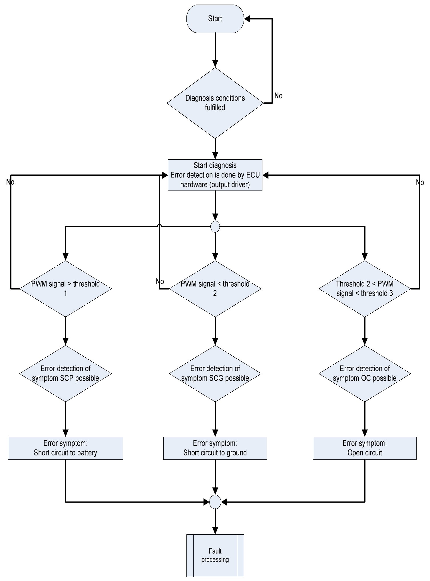 If the PWM from the fuel rail pressure regulator lies below the lower calibration limit, a short circuit to ground is detected and a minimum fault is set.