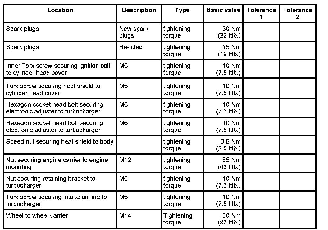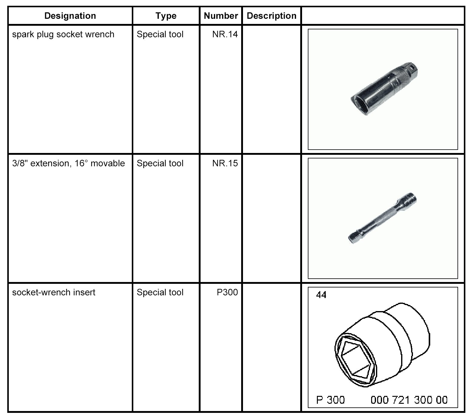 1. Install spark plugs using spark plug socket wrench NR.14 and 3/8" extension, 16° moveable NR.15. - Tightening torque: 30 Nm (22 ftlb.) - Tightening torque: 25 Nm (19 ftlb.)