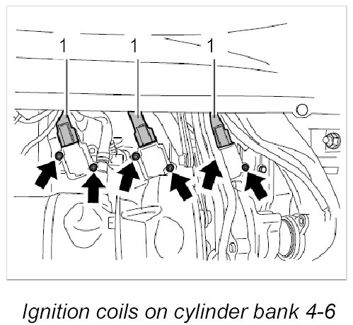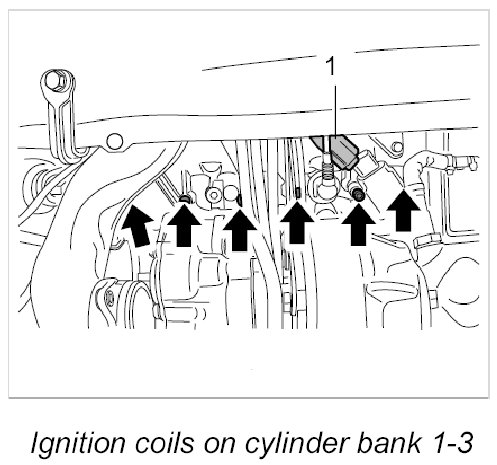 15. Release cable plugs -1- and pull them off the ignition coils.