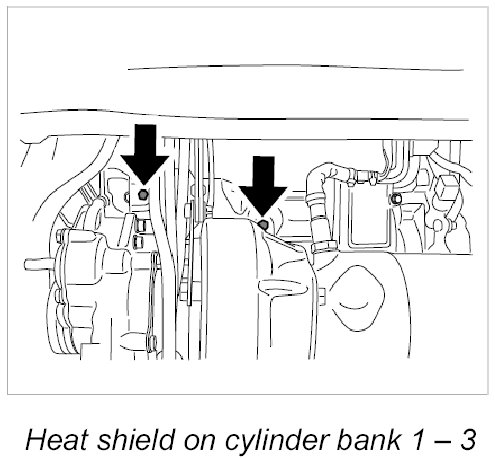 5. Insert the heat shields again and fasten them in place using two Torx screws (M6 x 12) -arrows- on each one. - tightening torque: 10 Nm (7.5 ftlb.)