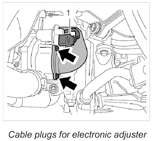 9. Release cable plugs -1- on the electronic boost pressure adjusters on the turbochargers and pull them off.