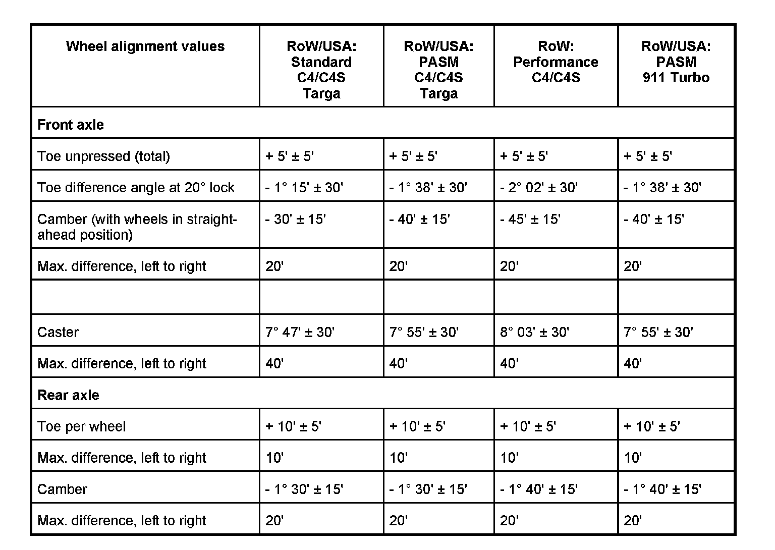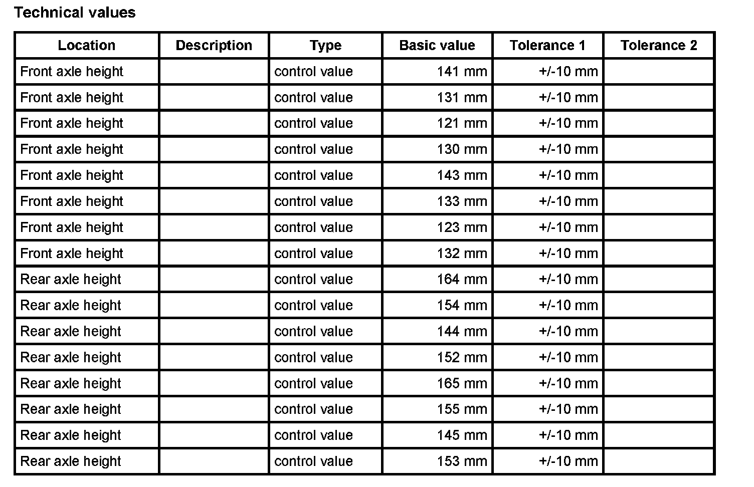 Adjustment values for suspension alignment